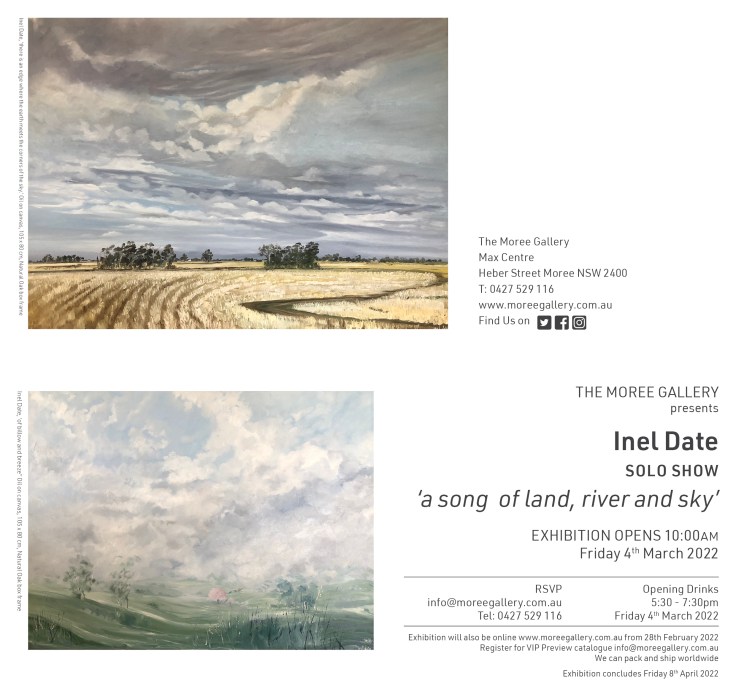 - “…a song of land, river and sky…” a solo exhibition @themoreegallery in Moree Northern NSW, March 2022 – completed